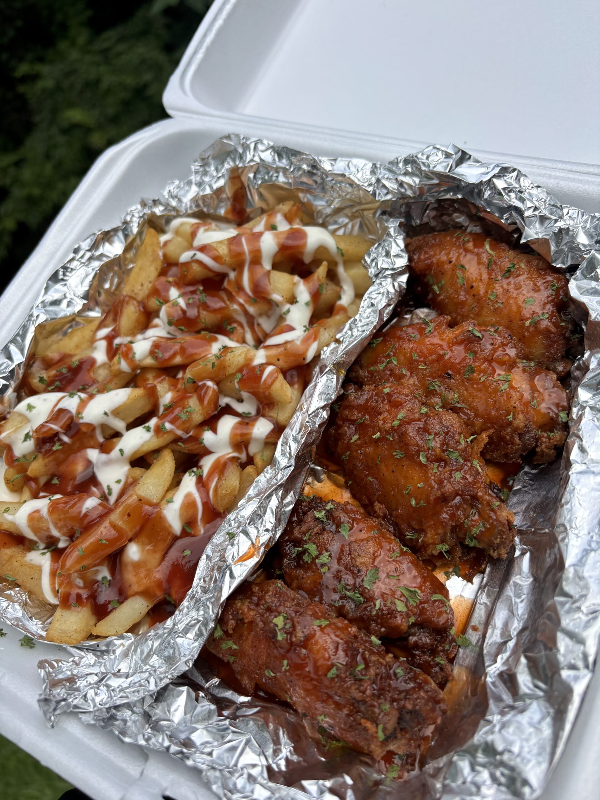 Enjoy our (6) six crispy, flavorful fried chicken wing pieces paired perfectly with golden, seasoned fries—an irresistible combo that hits all the right spots. Perfect for satisfying your cravings, this classic meal delivers comfort and bold taste in every bite. Comes w/ 1 sauce cup. Notice: All sauced fries contain ranch dressing in combination with the other sauce that you select.