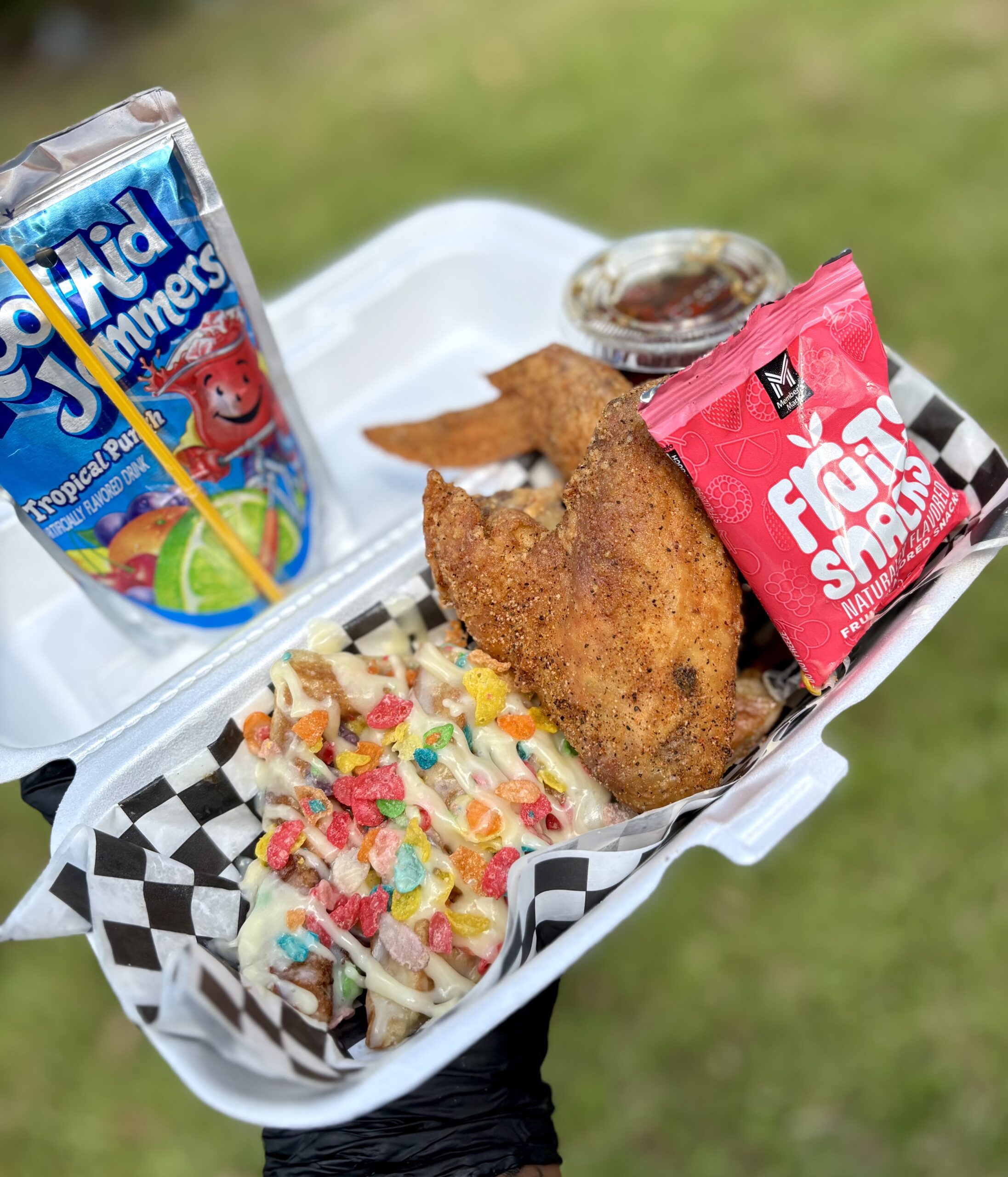 Discover the perfect Kid’s Meal at Str8 Out Dat Raq Eatz! This delicious combo features Raq Bites (Basic Toppings), tender two-piece chicken, sweet gummies, and a refreshing juice—making it a satisfying and fun meal for young food lovers. It’s all about flavor, variety, and keeping kids happy!